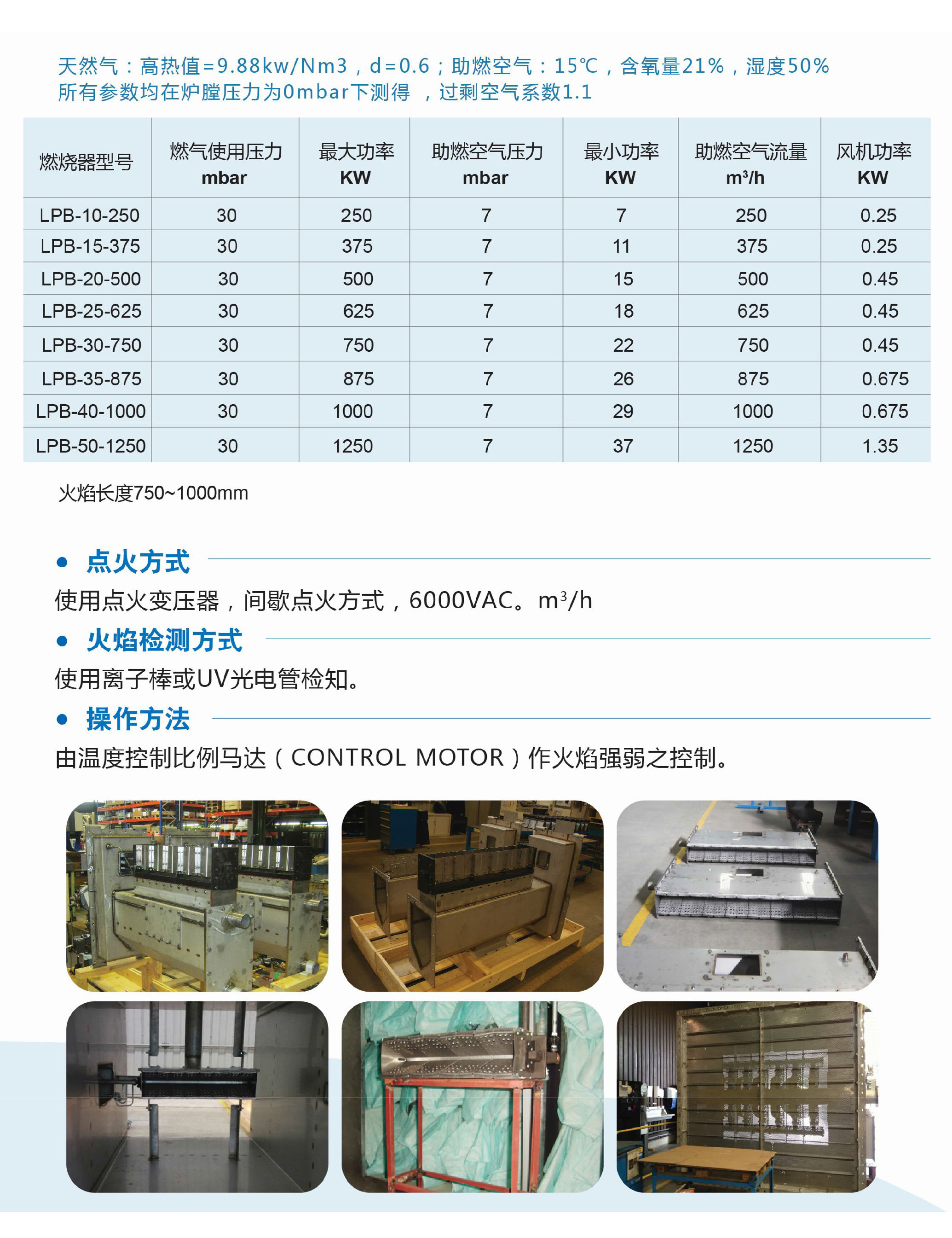 LPB燃烧器为喷嘴混合线性燃烧器,燃烧安定应用范围广,可使用天然气、丙烷、丁烷为燃料。LPB燃烧器T-D比大,调节比40:1。LPB燃烧器采用高强度钢制壳体,壳体外装配助燃风机,无需在风道中增加挡风板即可稳定运行。(订货时可不带助燃风机)LPB燃烧器点火结构简单,动作可靠。LPB燃烧器火焰短,长度为750~1000mm。LPB燃烧器低排放,适合要求大容量清洁热风的应用,包括干燥炉,食品烘焙,涂装烘干,造纸行业和类似的工业设备。LPB燃烧器单尺(英尺)最大输出为250KW。